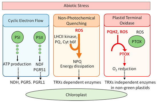 Chloroplast-based photoprotective mechanisms under stress conditions: CEF, NPQ, and PTOX pathways. Solid black arrows indicate the direction of electron flow or metabolic processes and dashed black arrows represent downstream activation or regulatory effects on specific redox-sensitive enzyme system. Orange arrow illustrates the induction of NPQ by ROS signals and red arrows show ROS-mediated activation and dashed red arrow denotes that O2 reduction by PTOX.