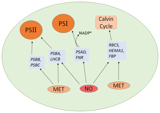 Nitric oxide and melatonin both play critical roles in regulating photosynthesis by modulating the expression of key genes involved in the photosystems, the Calvin cycle, and antioxidant defense mechanisms. Notably, both compounds upregulate HEMA1, a gene essential for chlorophyll biosynthesis, which enhances the light-absorbing capacity of plants [110,111,112]. In terms of photosystem function, both NO and melatonin upregulate PSBA, encoding the D1 protein of Photosystem II, and LHCB, responsible for light harvesting. PSAD plays a key role in ferredoxin-mediated NADP+ photoreduction on the reducing side of PSI [113]. NO upregulates FNR (ferredoxin-NADP+ reductase), enhancing NADP+ reduction and improving the overall efficiency of the electron transport chain [114]. MT and NO together enhanced photoprotection by activating the D1 repair pathway in PSII and improving NADP+ photoreduction in PSI during cold stress and NO is essential for MT-induced CO2 assimilation and photoprotection in cucumber seedlings [20]. These actions improve light capture and energy transfer within the photosystems. Melatonin uniquely upregulates additional photosystem genes, such as PSBB and PSBC [72], which are vital for the stability and function of Photosystem II. For the Calvin cycle, both NO and melatonin increase the expression of RBCS (the small subunit of Rubisco) and FBP (fructose-1,6-bisphosphatase), enhancing CO2 fixation and improving carbohydrate production [115,116]. It was reported that applying exogenous melatonin helped protect Rhododendron, an ornamental woody plant, from prolonged heat stress [117]. This protection was achieved by enhancing melatonin levels, boosting the electron transport rate, improving the activities of photosystem II and I, increasing rubisco activity, and elevating ATP content. Additionally, transcriptomic analysis revealed several heat-induced genes with altered expression linked to photosynthetic processes [117]. Figure 3 depicts genes related to NO and melatonin that are involved in the photosynthesis process.