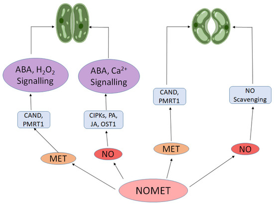 It is important to note that the physiological effects of exogenous NO and melatonin are strongly influenced by their concentration and exposure duration. Studies have shown that low to moderate concentrations of melatonin (e.g., 50–200 µM) or NO donors such as SNP (50–100 µM) typically enhance stress tolerance and photosynthetic activity, whereas higher concentrations may induce oxidative or nitrosative stress, disrupt redox signaling, or inhibit growth [108,118]. The timing and frequency of application also play a crucial role; prolonged exposure may desensitize signal transduction pathways or interfere with endogenous hormone balance. Therefore, dose–response optimization is essential when considering the exogenous use of NO and melatonin in plant systems. Therefore, proper optimization of dose and timing is critical when considering the application of these molecules in research or field conditions. Furthermore, both NO and melatonin boost the expression of SOD (superoxide dismutase), a key antioxidant enzyme that decompose O2•− and CAT, APX and GPX that breakdown H2O2 [119,120,121]. This action protects the photosynthetic machinery from oxidative stress, particularly under adverse environmental conditions, ensuring sustained photosynthetic performance. The all-coordinated gene expression ensures that the photosynthetic machinery remains robust and responsive to changing environmental conditions, thereby optimizing plant’s ability to adapt and thrive. Both NO and melatonin play dual role in stomatal movement. NO’s role extends beyond just influencing melatonin levels. It also plays a significant part in regulating stomatal conductance—critical for balancing water conservation with CO2 uptake. Under stress conditions, NO typically induces stomatal closure to reduce water loss through ABA signaling like ABA receptor, CIPKs (calcineurin B-like protein interacting protein kinase), OST1 (open stomata 1) and transcription factors [122,123]. NO also plays role in stomatal closure by small signaling peptides (CLAVATA3/embryo surrounding region (CLEs) [124], polyamines [125] and jasmonic acid [126]. Yet, melatonin can counteract this effect by re-opening stomata, thus facilitating continued CO2 uptake necessary for photosynthesis [86,127]. This delicate balance between NO-induced stomatal closure and melatonin-promoted stomatal opening illustrates the complementary roles these molecules play in maintaining photosynthetic efficiency. Furthermore, in Arabidopsis, the melatonin receptor CAND2 and PMTR1 regulates melatonin-induced stomatal closure via mediating Ca2+ and H2O2 signaling [88,98]. Figure 4 provides simple illustration of stomatal movement induced by NO and melatonin.
