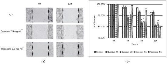 In this study, we also assessed the effects of treatment with Q. robur extract (2.5 mg·mL−1, 5.0 mg·mL−1, and 7.5 mg·mL−1) and the product Reoxcare (2.5 mg·mL−1) on cell migration using a wound-healing assay conducted on HaCaT cells evaluated at 0, 4, 8, and 12 h; the most significant results are presented in Figure 2. Cell migration was expressed as a percentage of cell-free area. Initially, all samples had a 100% cell-free area, establishing a uniform baseline for comparison.