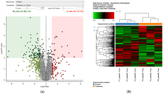 (a) Volcano plot displaying the differentially expressed proteins (DEPs) in HaCaT cells treated with Q. robur extract compared to the untreated control group. The X-axis represents the base-2 logarithm of the expression fold change (Log2 Ratio), and the Y-axis represents the negative base-10 logarithm of the p-value (–log10 p-value). Red dots indicate upregulated DEPs, while green dots represent downregulated DEPs. Gray dots denote proteins whose expression did not differ significantly between the groups. The threshold for statistical significance was set at a p-value < 0.01. In total, 96 proteins showed significant expression changes, with 21 upregulated and 75 downregulated. (b) Heatmap showing the DEPs in HaCaT cells treated with Q. robur extract compared to the control group (Ctrl). Protein abundance data were normalized and scaled after clustering. Pearson’s correlation was used as the distance function, and complete linkage was employed as the clustering method. Each row represents a protein, and each column represents an experimental sample. Proteins are hierarchically clustered based on their expression patterns. Colors indicate relative expression levels: green for low expression, black for medium expression, and red for high expression. Control samples are labeled as “Cont.” and treated samples as “Trea”. The dendrograms at the top and left illustrate the similar relationships among samples and proteins, respectively. The arrows mark the cut points in the column (top) and row (left) dendrograms delineating the two main clusters of samples (Control vs. Treatment) and proteins.