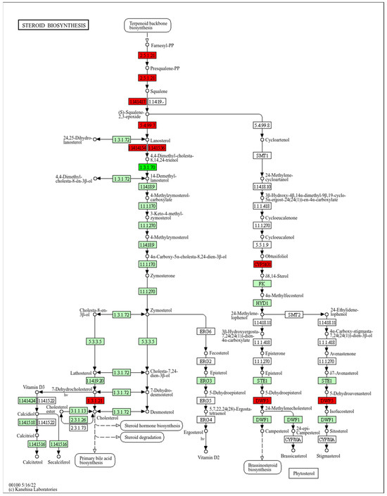 Steroid biosynthesis pathway in Homo sapiens (hsa00100) showing overexpressed (red) and underexpressed proteins (bright green) when cells were treated with aqueous extract of Q. robur. The image was obtained by a valid license from the KEGG module within Proteome Discoverer software 2.5 (Thermo Fisher Scientific, Waltham, MA, USA).
