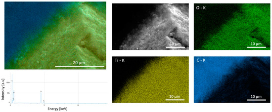 The EDX analysis of the oxides (Figure 2) shows that, in the spectrum of a given oxide, e.g., TiO2, there are three main components: carbon, which is present in abundance in the part of the image outside of the grain because they were taped onto the stub using carbon tape (see Section 3), and the pure oxide, which consists of the two elements, i.e., oxygen and the metal cation (in this case titanium). In the elemental map, it can be seen that the titanium is not present in the right top area on the carbon tape, whereas some oxygen is also present on the carbon tape, which is typical. No other elements are present in the EDX spectra of the samples (Figure 2).