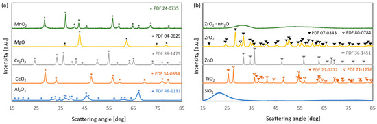 Ten metal oxides (Al2O3, CeO2, Cr2O3, MgO, MnO2, SiO2, TiO2, ZnO, ZrO2, and ZrO2·nH2O) were examined using the PXRD method (ex situ measurements). The main phases identified in the studied catalysts are indicated in Figure 4a,b. It can be seen that they are pure, as no other reflexes from any other phase have been detected. Among the tested metal oxides, two of them, SiO2 and ZrO2·nH2O, were amorphous. Titanium dioxide was a mixture of two polymorphs: rutile and anatase, whose relative ratio is 1.4:1. Crystalline zirconium dioxide was also a mixture of two polymorphs, with the monoclinic phase as the main component and a small fraction of the tetragonal phase. Based on Scherrer’s formula (for k = 0.89), the sizes of crystallites in the case of crystalline oxides were calculated. The results are summarized in Table 2 along with the specific surface area values of the oxides. All crystalline phases consisted of crystallites with an average size between 12 and 33 nm.