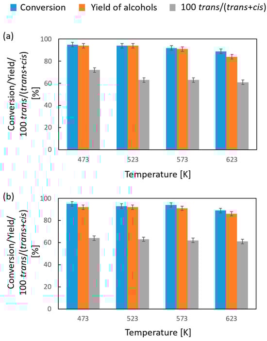 A study on the transfer hydrogenation reaction in the vapor phase from 2-propanol to 4-t-butylcyclohexanone was also carried out in the presence of MgO, the most active catalyst as per the previous part of our work. The results are summarized in Figure 5. Already at a temperature of 473 K, a 95% conversion of 4-t-butylcyclohexanone was recorded, which decreased slightly with an increase in the reaction temperature to 89% at 623 K. A similar profile of changes in ketone conversion was observed in the case of a test with the spent catalyst, which clearly excludes its deactivation as the reason for the reduction in conversion with the reaction temperature. In the test with a fresh catalyst, similarly to the conversion, the selectivity to alcohols and diastereoselectivity decreased with temperature. As for selectivity, its decrease from 97 to 94% was the result of aldol condensation between 4-t-butylcyclohexanone and acetone formed in the CTH reaction, whereas the decrease in diastereoselectivity of the reaction resulted from the equalizing effect of temperature on the molar ratio of diastereoisomeric 4-t-butylcyclohexanols. What is noteworthy is the significantly lower value of diastereoselectivity of the reaction to the trans diastereoisomer in the vapor phase, which is 61–63% compared to the value obtained in the liquid phase with the same hydrogen donor (97%). This value is a result of two factors, namely, the following: the high reaction temperature in the vapor phase and the mechanism of the reaction. It is commonly accepted that Catalytic Transfer Hydrogenation over MgO [37] and other catalysts [27,31,32,33] occurs via the Meerwein–Ponndorf–Verley mechanism, whose key step is the transfer of a hydride anion from the carbinol atom of the donor to the carbonyl group of the acceptor. Therefore, the stereochemistry of the attack of the hydride anion on the carbonyl carbon in the ketone molecule also impacts the cis/trans ratio. There is no doubt that the adsorption of 4-t-butylcyclohexanone on the MgO surface involves the interaction of carbonyl oxygen with the Lewis acid site, which is the surface magnesium cation. Under these conditions, the t-butyl group in the equatorial position is protruding from the surface. Hence, the attack of the hydride anion from an axial position is very strongly favored. In the CTH of the 4-t-butylcyclohexanone reaction in the vapor phase, there are two explanations for the significantly lower diastereoselectivity of the reaction to the trans stereoisomer. In the first one, it is assumed that, after adsorption of the donor on the catalyst surface, the ketone attacks from the vapor- phase and this attack take place in a statistical manner, because the bulk substituent in the form of the t-butyl group located in position 4 does not create a significant steric hindrance for the attack of the carbonyl carbon atom located in position 1. In the second explanation, it should be assumed that the CTH reaction is fast and reversible under the reaction conditions, and this causes the composition of 4-t-butylcyclohexanols to be equilibrated.