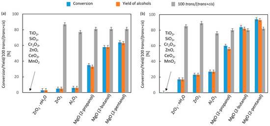 The catalytic activity of all four metal oxides from the second group of catalysts was tested in the transfer hydrogenation reaction using 2-propanol as a hydrogen donor. The results of these studies are summarized in Table 6. It was found that changing the hydrogen donor from 2-octanol to 2-propanol and thus lowering the reaction temperature from 452 to 355 K resulted in differences in the conversion of 4-t-butylcyclohexanone in the group of the most active catalysts. ZrO2 turned out to be the least active catalyst after 3 h of reaction. In its presence, only 47% conversion was recorded. In the case of the remaining oxides, the decrease in conversion, associated with the lower reaction temperature, was smaller. It is noteworthy that the selectivity to 4-t-butylcyclohexanols in the case of Al2O3 was 99–100%. At this temperature (355 K), the subsequent dehydration reaction of the primary products of the transfer hydrogenation reaction practically does not occur. MgO remained the most active oxide in the reaction, with a conversion of 86%, and with high (>95%) selectivity to alcohols. It was found that, at 355 K, the diastereoselectivities of the reaction to the trans isomer for all catalysts were higher than those observed at the higher temperature (452 K). This is due to the equalizing effect of temperature increase on the stability of alcohol isomers. The highest value of diastereoselectivity to the trans isomer (97%) was observed in the case of MgO (Table 6).
