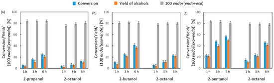 No influence of reaction temperature or hydrogen donor structure on the diastereoselectivity of the reaction was found (Figure 7). The value of this parameter fell within the range 78–84% in favor of the endo stereoisomer and was very far from the reference value (21 ± 1%). The invariance of the value of this parameter despite the use of hydrogen donors with different chain lengths indicates that, in the case of all donors used in the reaction, the reducing agent is a hydride anion.