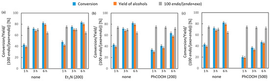Continuing the investigation of the CTH of 2-norbornanone with 2-octanol in the presence of ZrO2·nH2O as the catalyst, we performed preliminary measurements of the activity of this catalyst treated with triethylamine and benzoic acid to selectively poison the surface Brønsted acidic (Et3N) and basic (PhCOOH) sites. The results of these measurements are shown in Figure 8. It was observed that poisoning of the Brønsted acid sites of the catalyst using Et3N at a concentration of 200 µmol·g−1 does not cause any changes in the activity, the selectivity towards alcohols, or in the diastereoselectivity of the reaction. In contrast, the application of benzoic acid onto the catalyst surface at a concentration of 200 µmol·g−1 results in a decrease in its activity in the reaction from a conversion value of 82% to 64% after 6 h. A further decrease in activity to 47% after 6 h was noted for the catalyst poisoned with benzoic acid at a concentration of 500 µmol·g−1. To sum up this part of this study, it should be stated that the Brønsted acid sites do not participate in the reaction, but the basic sites, i.e., oxide anions, do.