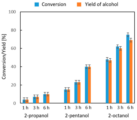 In the next stage of the studies using 2-norbornanone as hydrogen acceptor, we determined the influence of the hydrogen donor structure on the CTH of one ketone with a set of secondary alcohols: 2-propanol, 2-butanol, 2-pentanol, and 2-octanol. In order to eliminate differences in the boiling points of individual donors and as their consequence differences in the observed reactivity, we performed activity measurements in the liquid phase at three temperatures: 355, 373, and 392 K, corresponding to the boiling points of 2-propanol, 2-butanol, and 2-pentanol, respectively (Figure 7). This method of conducting the reaction allowed us to determine the contribution resulting solely from the donor structure in the catalyst activity. Figure 7 shows the results of the comparison of the reactivity of three pairs of donors: 2-propanol and 2-octanol, 2-butanol and 2-octanol, and 2-pentanol and 2-octanol at the reaction temperatures determined by the boiling points of 2-propanol (355 K), 2-butanol (373 K), and 2-pentanol (392 K). It was shown that, for each pair of alcohols used as hydrogen donors in the reaction with 2-norbornanone, the alcohol with the lower number of carbon atoms is more reactive. Thus, at 355 K after 6 h of reaction, conversions of 25 and 13% were achieved, respectively, for the pair 2-propanol and 2-octanol, and a similar reactivity ratio, described by the ratio of 2 to 1, was noted at 373 K for the pair 2-butanol and 2-octanol. Only at the highest tested temperature (392 K) was the reactivity of 2-octanol after 6 h (46%) only somewhat lower than that of 2-pentanol (57%).