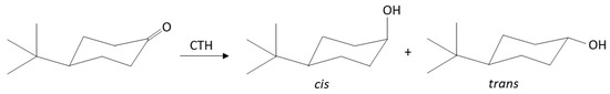 The presence of alkyl substituents in cyclohexanone molecules implies that, after reduction of their carbonyl groups, the substituted cyclohexanols formed in this way are no longer conformations but become specific configurations. This is due to significant differences in the stability of individual potential conformations resulting from different interactions of alkyl substituents in equatorial or axial positions of the cyclohexane ring. This view, presented by Winstein and Holness, was of great importance for understanding the course of the reduction in cyclic ketones, according to which, the introduction of a bulky alkyl group, such as t-butyl, into the cyclohexane molecule prevents conformational transformations of the ring and leads to the formation of two diastereomeric 4-t-butylcyclohexanols as a result of the reduction of 4-t-butylcyclohexanone [35].