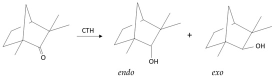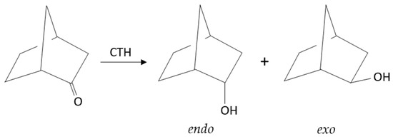 The third part of our research is devoted to the Catalytic Transfer Hydrogenation of three bicyclic ketones: 2-norbornanone, camphor, and fenchone, in which the methylene bridge between the first and fourth carbon atoms of the 2-cyclohexanone ring stiffens the entire molecule. Moreover, in the case of the last two ketones, three methyl substituents located in different places in their molecules generate steric hindrances with different effects on both the reactivity of the ketones and the stereochemistry of the reduction of their carbonyl groups. The transfer hydrogenation of these three ketones is illustrated in Scheme 3, Scheme 4 and Scheme 5.