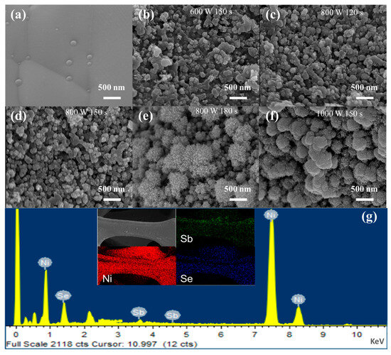 The microscopic morphology of NiSb/NiSe was examined using scanning electron microscopy (SEM), revealing the self-growth of NiSb/NiSe nanoparticles on nickel foam, with an overall morphology characterized by the distribution of nanoball particles. The microscopic morphology of blank nickel foam was presented in Figure 1a. The preparation conditions depicted in Figure 1b–d were 600 W for 150 s, 800 W for 120 s, and 800 W for 150 s. The figures indicated that as microwave power and reaction time increased, the product particles became more homogeneous, with those prepared at 800 W for 150 s exhibiting a size of approximately 100 nm. Further increase in microwave heating time or power resulted in significant changes in product size, reaching approximately 500 nm with a flower-like distribution (Figure 1e,f). The size and microscopic morphology of NiSb/NiSe particles can be regulated by microwave power and time, both of which significantly influence electrochemical performance. Uniform morphology was essential for achieving superior electrochemical performance. The highest capacity value was achieved with a uniform nanosphere morphology at 800 W for 150 s. Energy dispersive spectroscopy (EDS) plots confirmed the successful self-growth of NiSb/NiSe complexes on nickel foam. The complexation of NiSb and NiSe enhanced the number of electrically active sites and improved conductivity, thereby accelerating electron and ion migration. Similarly, EDS plots demonstrated the simultaneous presence of Ni, Sb, and Se, confirming the successful preparation of the composite electrode material.