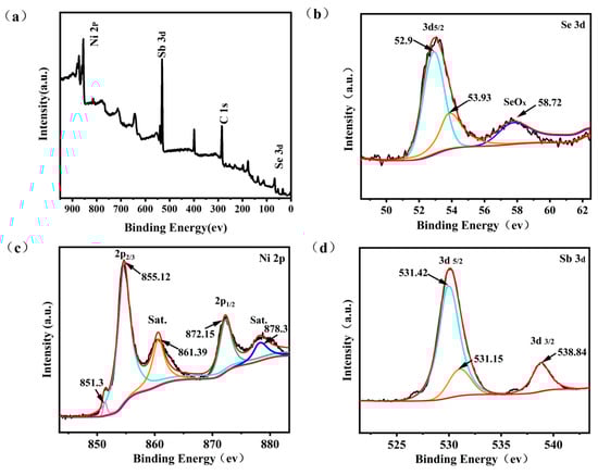 (a) XPS survey spectrum; XPS elemental spectra of (b) Se 3d (c) Ni 2p (d) Sb 3d of NiSb/NiSe electrode material.