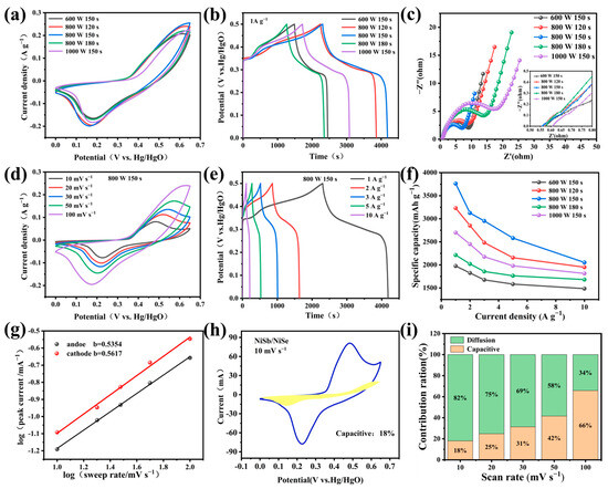 (a) CV curves of NiSb/NiSe under different microwave conditions; (b) GCD curves for different reaction parameters; (c) Nernquist diagram of NiSb/NiSe under different reaction parameters; (d) CV curve of NiSb/NiSe under optimal conditions (800 W/150 s); (e) GCD curve of sample A3; (f) The specific capacity of NiSb/NiSe samples under different preparation conditions; (g) NiSb/NiSe charge storage dynamics calculation; (h) Capacity share of NiSb/NiSe energy storage at 10 mV−1; (i) Relative contribution of capacity and diffusion-controlled charge storage.