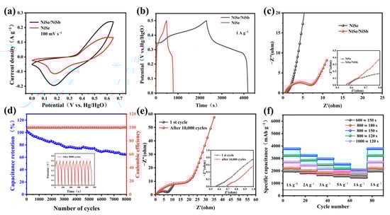(a) CV diagrams of NiSb/NiSe and NiSe; (b) GCD curves of NiSb/NiSe and NiSe; (c) EIS charts for NiSb/NiSe and NiSe; (d) cycle stability and coulomb efficiency; (e) EIS maps before and after the cycle; (f) magnification performance chart.