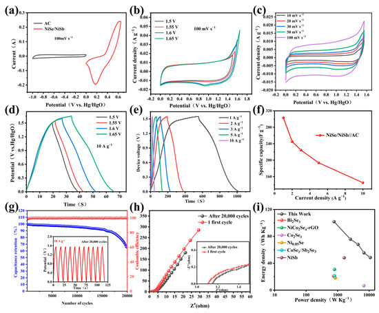 (a) CV plots of NiSb/NiSe and AC; (b) CV diagrams at different voltages; (c) CV map of NiSb/NiSe//AC at different scanning rates at 1.6 V; (d) GCD curves at different voltages (10 A g−1); (e) GCD curve of NiSb/NiSe//AC AC at different currents; (f) Line chart of current GCD curve of NiSb/NiSe//AC at different voltages; (g) cycle stability and coulomb efficiency; (h) EIS maps before and after 20,000 cycles; (i) Energy-power density diagram of different devices.