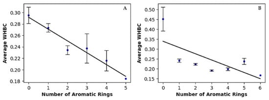 Hydrogen bonding is widely recognized as a key contributor to ligand binding in proteins. To evaluate the contribution of hydrogen bonding to binding affinity independently of molecular size, we introduced an innovative molecular descriptor named Weighted Hydrogen Bond Count (WHBC) [36]. WHBC provides a clear representation of hydrogen bonding potential relative to molecular size by calculating the sum of hydrogen bond donors and acceptors normalized by the total number of non-hydrogen atoms in the molecule: (nHDon + nHAcc)/nSK. For each aromatic ring count, the average WHBC values were calculated and presented in the last column of Table 3. Figure 1 plots these average WHBC values against the number of aromatic rings, revealing a negative correlation: WHBC decreases as the number of aromatic rings increases. Covalent inhibitors (Figure 1A) exhibit a pronounced negative correlation, with data points tightly clustered along a descending regression line. In contrast, non-covalent inhibitors (Figure 1B) show a broader distribution of data points, indicating a somewhat weaker yet still significant negative correlation. Notably, a validation test conducted on a randomly selected dataset of 1000 compounds from the PubChem library revealed no direct correlation between WHBC and the number of aromatic rings (see Figure S3 and associated description in Supplementary Materials).
