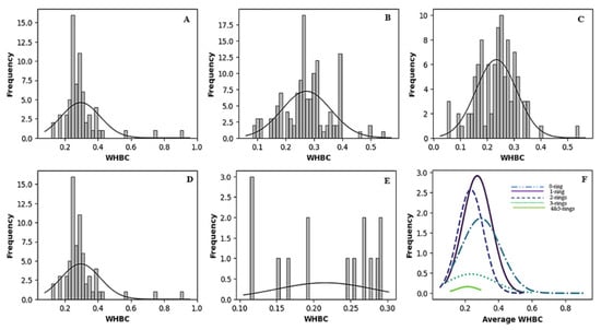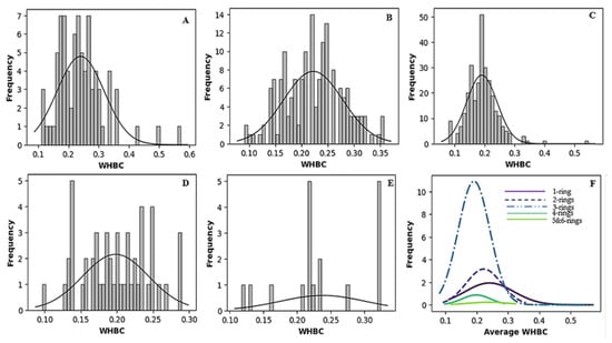 Histogram of the number of weighted hydrogen bond count versus frequency for different classes of non-covalent inhibitors. (A) One aromatic ring, (B) two aromatic rings, (C) three aromatic rings, (D) four aromatic rings, (E) five or more aromatic rings, (F) normal distribution of the number of hydrogen bond count for the different classes of ligands.