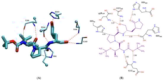 Figure 4 illustrates the intermolecular interactions between the covalent inhibitor F2F-2020198-00X and key interacting residues within the Mpro active site. Figure 4A shows the three-dimensional structural representation of residues involved in hydrogen bonding and CH–π interactions. Figure 4B offers a schematic two-dimensional interaction map, clearly depicting all identified interaction types. As indicated, F2F-2020198-00X predominantly engages the Mpro active site through hydrogen bonding. Residues Ser144, His164, His163, and Gly143 form hydrogen bonds with F2F-2020198-00X at interaction distances of 3.29 Å, 3.10 Å, 2.74 Å, and 3.20 Å, respectively. Notably, His163 establishes a hydrogen bond via its side chain, whereas the remaining residues utilize their main chains. Additionally, Glu166 participates with its main chain in forming a dual hydrogen bond with the inhibitor. Furthermore, His41 contributes to ligand stabilization through a CH–π interaction using its side chain, as detailed in Figure 4B.