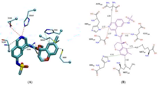 Modes of intermolecular interactions between the non-covalently bound EDG-MED-10fcb19e-1 and its interacting residues within the Mpro enzyme. (A) Structures of residues (in licorice representation) involved in hydrogen bonding, π–π stacking and CH–π interactions with EDG-MED-10fcb19e-1 (Ligand ID: R5O) based on the 1.68 Å resolution X-ray crystal structure (PDB ID: 7GL5 [41]). Dashed lines indicate the closest interatomic distance. The structure was generated with the VMD program [42]. (B) A schematic intermolecular interaction map between EDG-MED-10fcb19e-1 and its interacting residues, with dashed lines indicating interatomic distances in Å. (color code: hydrogen bonding interactions in red, CH–π interactions in black, and π–π interactions in green).