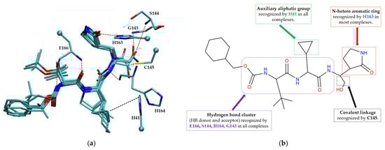 Our comprehensive analysis of multiple covalent and non-covalent inhibitors underscores the significance of four residues consistently involved in stabilizing both inhibitor classes, namely H41, S144, H163, and E166. Among these, H41 often engages in π–π stacking or CH–π interactions with the aromatic portions of the inhibitors, thereby leveraging ring-based contacts for enhanced stability and binding affinity. E166, H163, and S144 principally form hydrogen bonds—either via side chains (H163) or backbone atoms (S144 and E166)—reinforcing the integrity of the binding pocket. These polar contacts, in tandem with ring-based interactions, point to a synergistic interplay between hydrogen bonding and non-bonded π interactions in stabilizing the ligands. The ability of these four residues to facilitate multiple interaction modes underscores their importance in molecular recognition and suggests they are high-value targets for designing inhibitors that retain potency across different Mpro variants [44].