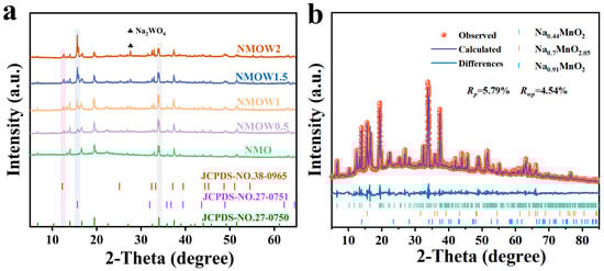 (a) XRD patterns of NMO, NMOW0.5, NMOW1, NMOW1.5, and NMOW2. (b) Rietveld refinement patterns of XRD for NMOW1.