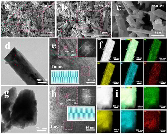 (a–c) SEM images. (d–i) TEM, high-resolution TEM images, and EDS mappings for NMOW1 cathode, with rod-like and plate-like structures.