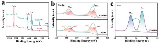 (a) XPS survey spectra of NMOW1 and NMO samples. High-resolution XPS of Mn 2p (b) and W 4f (c).