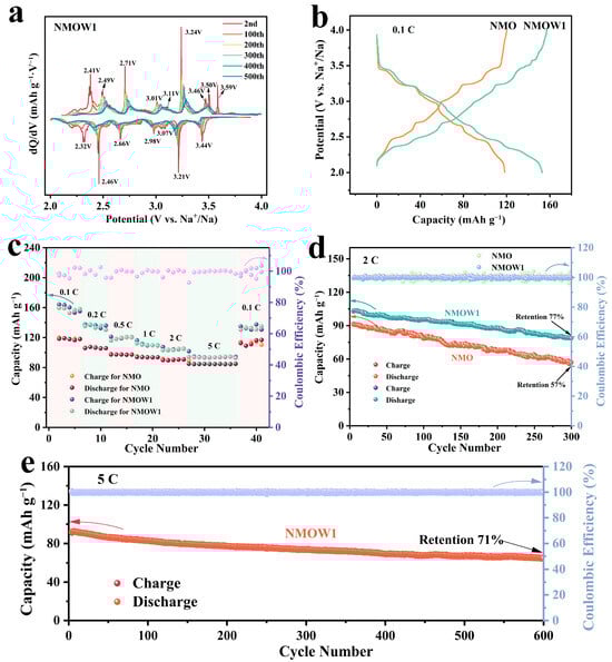 The sodium storage performance of the NMO and NMOW cathodes are summarized in Figure 4 and Figures S4–S7. The dQ/dV profiles of the NMOW1 exhibit various pairs of reversible redox peaks in the range of 2.0 to 4.0 V (Figure 4a), which are in good agreement with the galvanostatic charge/discharge (GCD) profiles that identify the multi-step plateaus (Figure 4b). This phenomenon illustrates that the NMOW1 cathode undergoes a complex multiphase transformation during the sodiation/desodiation processes [14]. Figure S4a shows the cyclic voltammetry (CV) profiles for NMO and NMOW1, where the NMOW1 cathode displays a larger enclosed area in the CV curve than does the NMO example, indicating that the NMOW1 possesses a higher capacity due to the presence of a small proportion of the layered phase. Notably, the redox peak positions and shapes for NMOW1 are almost identical to those of NMO, as the tunnel phase is predominant. According to the redox and phase transition mechanisms, the redox peaks at the high potential range (2.5–4.0 V) are related to the Na+/vacancy ordering transition [50,51]. Other peaks in the low potential region (below 2.5 V) are correlated with the Mn3+/Mn4+ redox reactions [37,38,52]. In addition, the CV profiles of the NMOW1 cathode for the first six cycles overlap well (Figure S4b), manifesting high reversibility and low polarization.