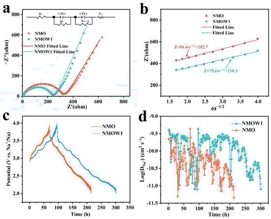 (a) Nyquist plots of NMO and NMOW1 after five cycles at 2 C. (b) The relationship of Z′ and ω−1/2 at low-frequency. GITT profiles (c) and the Na+ diffusion coefficients (d) of NMO and NMOW1.