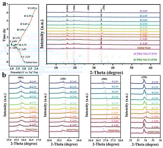 Phase transformation of the NMOW1 material in the Na+ insertion/extraction processes was studied using ex situ XRD during the first cycles at different voltage states. As depicted in Figure 6a, the NMOW1 cathode primarily exhibits typical diffraction peaks corresponding to the tunnel and P2-type layered structures. Specifically, the (002) diffraction peak from 15.0° to 17.0° is indexed to the P2 layered structure (Figure 6b). This peak shifts slightly with the potential increasing from 3.2 to 4 V due to more Na+ being continuously extracted, accompanying the emergence of the intermediate OP4 phase between the P2 and O2 phases [14,38,52]. Meanwhile, the major characteristic diffraction peaks for (200), (080), and (350) are attributed to the typical tunnel phase. These peaks shift to higher angles during the Na+ deintercalation process, indicating a contraction of the lattice parameters in the tunnel structure [25,53]. Subsequently, these peaks gradually return to their original positions during the Na+ intercalation process. These results further validate the outstanding structural reversibility and stability of the NMOW1 cathode, contributing to its impressive cycle performance.