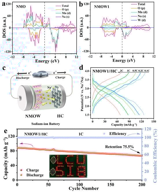 DOS calculation of NMO (a) and NMOW1 (b). (c) Schematic diagram of sodium-ion full cell. (d) GCD curves of the NMOW1//HC device at various current rates. (e) Cycling capability of the NMOW1//HC device at 1 C, and the illustration shows the LED lights lit up by the NMOW1//HC.