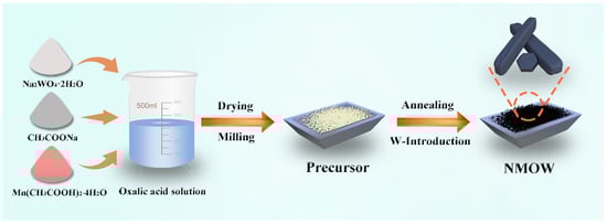 W-substituted Na0.44Mn1−xWxO2 (x = 0.005, 0.01, 0.015, and 0.02, called NMOW0.5, NMOW1, NMOW1.5, and NMOW2, respectively) cathodes were prepared via the co-precipitation method, and the schematic diagram is shown in Scheme 1.