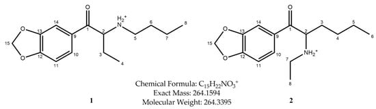 In this study, we present the identification and physicochemical characterization of two isomeric cathinone MDMA-like derivatives, namely, N-butyl-norbutylone (1) (1-(2H-1,3-benzodioxol-5-yl)-2-(butylamino)butan-1-one) and N-ethylhexylone (2) (1-(2H-1,3-benzodioxol-5-yl)-2-(ethylamino)hexane-1-one), found in seized materials (shown in Figure 1).