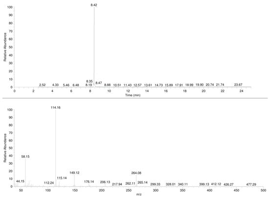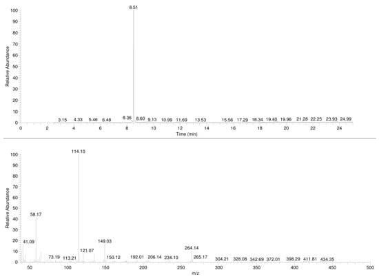 In the mass spectrum obtained in the electron impact ionization mode (EI-MS), shown in Figure 1 and Figure 2, one main fragment ion was detected at 114 m/z for both investigated compounds. Other less intense fragments present in the spectra were at 58 and 149 m/z for compound 1 and for compound 2. Possible structures of the fragmentation products derived from the parent structure of the analyzed compounds are presented in Figure 6 and Figure 7, respectively.