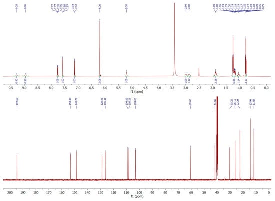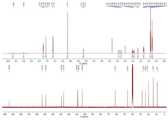 NMR was employed to confirm the structures of investigated compounds. The 1H and 13C nuclear magnetic resonance spectra for both compounds are shown in Figure 4 and Figure 5. Furthermore, all data concerning chemical shifts are shown in Table 1 and Table 2.