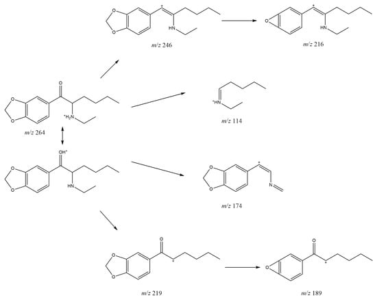 Predicted EI-MS fragmentation pathway of N-ethylhexylone (2).