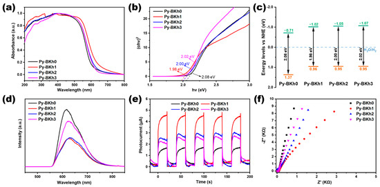 The separation and transfer of photogenerated electron–hole pairs (e−-h+) are key processes in photocatalysis. To further investigate the charge carrier separation efficiency of the polymers, we characterized the photophysical properties of the four conjugated organic polymer samples using steady-state photoluminescence (PL) spectroscopy, transient photocurrent response (TPR), and electrochemical impedance spectroscopy (EIS), as shown in Figure 2d–f. Steady-state PL spectroscopy is widely used to evaluate the radiative recombination of photogenerated charge carriers [46,47,48,49]. A higher PL intensity typically indicates stronger radiative recombination and lower charge separation efficiency, which is detrimental to photocatalytic activity. Figure 2d displays the PL intensities with a sequence of Py-BKh0 > Py-BKh3 > Py-BKh2 > Py-BKh1 under 400 nm excitation. The strong PL signal of Py-BKh0 suggests severe electron–hole recombination and poor charge separation efficiency, limiting its photocatalytic activity. In contrast, the introduction of the secondary donor DBBTh significantly suppresses PL intensity, with Py-BKh1 showing the weakest emission. This confirms that the D1-A-D2 ternary polymeric architecture effectively reduces radiative recombination and enhances charge separation, thereby improving photocatalytic efficiency. TPR and EIS measurements were further conducted to evaluate charge separation dynamics. TPR analysis (Figure 2e) reveals that the ternary polymers (Py-BKh1–3) showed more enhanced photocurrent responses than that of Py-BKh0 under full-spectrum xenon lamp irradiation, indicating superior charge separation and transport capabilities in the DBBTh-modified polymers. EIS Nyquist plots (Figure 2f) demonstrate reduced charge transfer resistance for the ternary polymers, as evidenced by smaller semicircle radii. Py-BKh1 shows the smallest radius, corresponding to the lowest interfacial resistance and most efficient suppression of electron–hole recombination. These results align with the TPR results, confirming that the secondary donor DBBTh facilitates charge separation. Collectively, these characterizations demonstrate that the D1-A-D2 configuration promotes directional electron transfer toward acceptor units, enabling the efficient reduction of H+ to H2. This structural design synergistically enhances light absorption, charge separation, and catalytic activity, providing a robust strategy for developing high-performance polymeric photocatalysts.