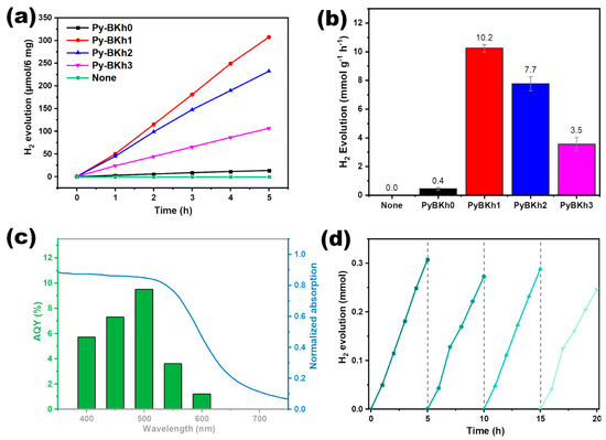 (a) Hydrogen production rate over time, (b) normalized HER for all CPPs, (c) AQY of Py-BKh1 at different wavelengths, (d) cyclic hydrogen production test for Py-BKh1.