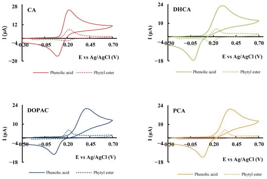 Comparison of the voltammetric response of phenolic acids (solid line) and their corresponding phytyl esters (dashed line). Cyclic voltammograms obtained in a phosphate buffer (pH 7.4) using a glassy carbon electrode (GCE) at 100 mV/s for 1 mM of compound.