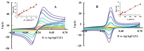 Overlay of cyclic voltammograms at different scan rates: 5, 10, 20, 50, 100, 200, 400, 600, and 800 mV/s obtained in a phosphate buffer (pH 7.4) using a GCE for (A) 1 mM of CA; inset: Ipa vs. v1/2. (B) 1 mM of CA-P; inset: Ipa vs. v.