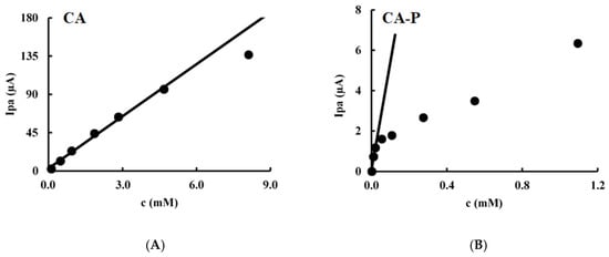 Effect of concentration on Ip at 100 mV/s obtained in a phosphate buffer (pH 7.4) using a GCE for (A) CA and (B) CA-P.