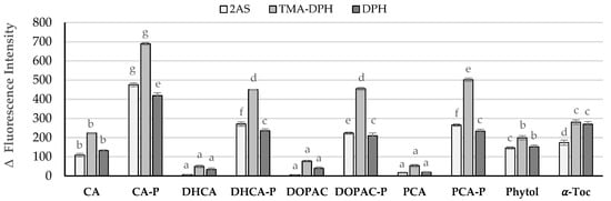 Esterifying phenolic acids with phytol enhances their liposolubility, as indicated by miLog p values, bringing them closer to that of α-Toc (Table 2). This increase in liposolubility suggests an improved ability for these phenolipids to interact with biomembranes. To investigate how these phenolipids interact with lipid bilayers, two simplified biomembrane models were employed. Liposomes made of 1,2-dimyristoyl-sn-glycero-3-phosphocholine (DMPC) were prepared and incorporated with three different fluorescent membrane probes—2-hydroxyacid-(9-anthroyloxy)stearic acid (2-AS), 1,6-diphenyl-1,3,5-hexatriene-4′-trimethylammonium tosylate (TMA-DPH), and 1,6-diphenyl-1,3,5-hexatriene (DPH)—which localize at various depths from the bilayer center (16, 10.9, and 7.8 Å, respectively) [].