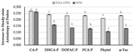 Increase in the steady-state anisotropy of probes TMA-DPH and DPH in DMPC liposomes. Error bars represent standard deviation. Different letters for each probe represent statistically different means, p < 0.05.