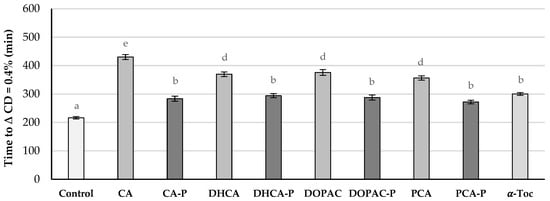 Time in minutes required for liposomes incubated at 37 °C without (control) and with AOs at 0.75 μM in the presence of AAPH to reach a conjugated diene (CD) content of 0.4%. Error bars represent standard deviation. Different letters represent statistically different means, p < 0.05.
