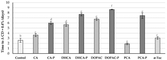 Time in days required for liposomes incubated at 37 °C without (control) and with AOs at 0.75 μM to reach a conjugated diene (CD) content of 0.4%. Error bars represent standard deviation. Different letters represent statistically different means, p < 0.05.