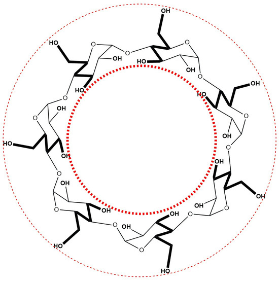 Cyclodextrins (CDs) are cyclic oligosaccharides composed of glucopyranose units linked by 1,4-glycosidic bonds. The three primary types of cyclodextrins—α, β, and γ—consist of six, seven, and eight glucopyranose units, respectively [1]. Structurally, cyclodextrins exhibit a truncated cone shape characterized by a hydrophobic internal cavity and a hydrophilic external surface, arising from the arrangement of their pyranose units. The hydrophobicity of the cavity is attributed to the presence of skeletal carbon atoms and ethereal oxygen, which facilitates the encapsulation of hydrophobic molecules of appropriate size within the cavity [2]. The hydrophobic cavity creates a space that allows poorly water-soluble molecules to protect their most hydrophobic regions. Contact between such a poorly soluble compound and a cyclodextrin in an aqueous environment can result in complexation. The hydrophilic exterior of cyclodextrins enables these complexes to be water-soluble. Therefore, CDs are known for forming inclusion complexes with various molecular species through several driving forces, with hydrophobic interactions playing a significant role. Of the three most important cyclodextrins, βCD (with a cavity diameter of 6.0–6.4 Å) is the cyclodextrin of most interest because its cavity size allows for the best spatial fit for many common guest moieties [3] (Figure 1).