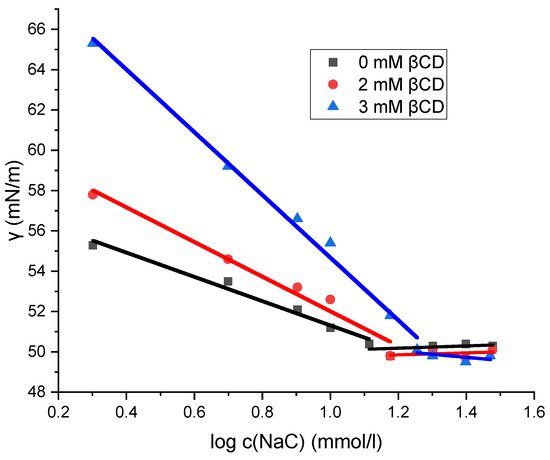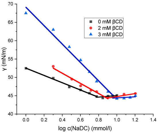 Although the CMC of sodium deoxycholate (NaDC) and sodium cholate (NaC) increases in the presence of βCD (due to the formation of inclusion complexes), the surface tension values remain unaffected within the limits of determination error (Figure 3 and Figure 4). These findings suggest that the inclusion complexes of βCD formed with the surfactants NaDC and NaC do not incorporate into the interface of bulk solution–air and that only surfactants themselves are accumulating and saturating at CMC the interface. If surfactants in inclusion complexes with βCD do not incorporate into the solution interface, then the principle of detailed balance applies [37], indicating that each equilibrium process occurring (i.e., micelle formation and inclusion complex formation) is thermodynamically independent. The increase in CMC in the presence of βCD (CMCCD) reflects the excess amount of surfactant that binds to the inclusion complex, maintaining a constant distribution of monomers among the described states (monomers form bulk, from interface and from micellar state that began formation at critical micelle concentration): ΔCMC = CMCCD − CMC. Thus, even in the presence of a parallel reaction of the inclusion complex formation, the same equilibrium concentration of monomeric surfactant exists and is equal to the CMC, which enables the application of the Equation (1).
