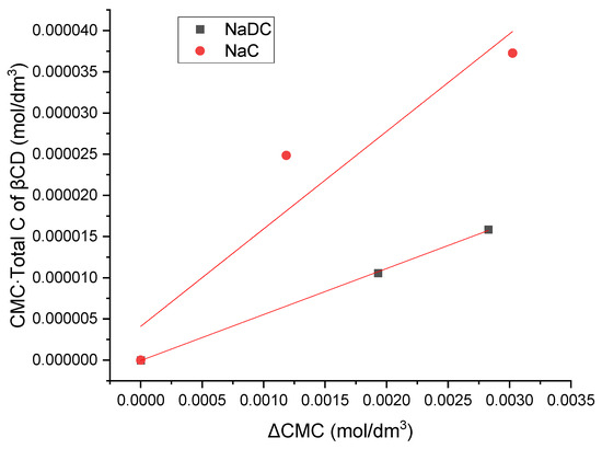 The experimental data (Table 1) show that the critical micellar concentration (CMC) of sodium deoxycholate (NaDC) and sodium cholate (NaC) increases in the presence of β-cyclodextrin (βCD) due to formation of inclusion complexes between bile salts and βCD. In an aqueous solution at a CMC, the equilibrium distribution of surfactant between its monomeric, micellar (the bulk solution), and Gibbs interface (aqueous solution–air interface) forms is a constant state, characterized by CMC at constant pressure and temperature. The increase in CMC in the presence of β-cyclodextrin represents the excess amount of surfactant that binds to the inclusion complex, maintaining a constant distribution of monomers among the described states [30].