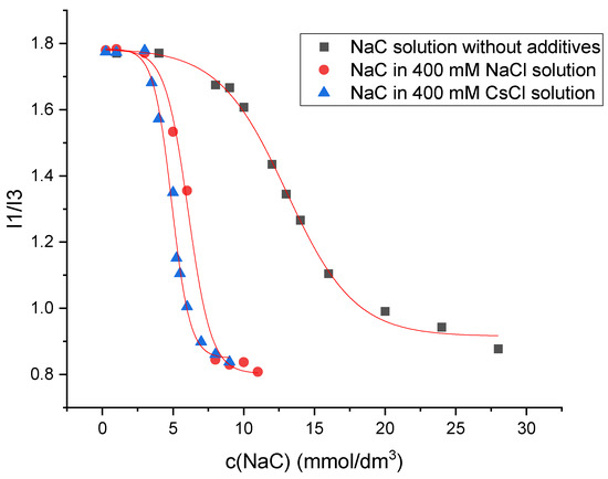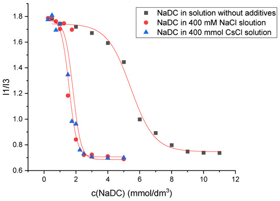 The determination of the critical micellar concentration (CMC) by spectrofluorometry is an invasive technique that employs pyrene as a hydrophobic probe molecule, which becomes incorporated into the micellar core upon micelle formation. A sharp change in the intensity ratio of the first and third vibronic emission bands of pyrene in the fluorescence measurements indicates the onset of the micellization, causing the decline in the polarity of the pyrene microenvironment [34]. Therefore, this change in the I1/I3 ratio as a function of surfactant concentration (c) can be used to determine the critical micelle concentration. Figure 7 shows the plot obtained for sodium deoxycholate (NaDC) in aqueous solution without additives, in 400 mM NaCl solution, and in 400 mM CsCl solution at a temperature of 298.15 K, whereas Figure 8 shows the plot obtained for sodium cholate (NaC) in aqueous solution without additives, in 400 mM NaCl solution, and in 400 mM CsCl solution at a temperature of 298.15 K.